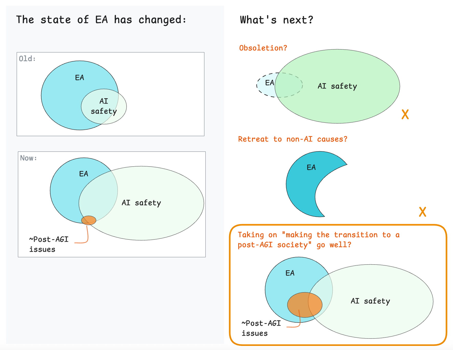 I argue for a third way: EA should embrace the mission of making the transition to a post-AGI society go well, significantly expanding our cause area focus beyond traditional AI safety. This means working on neglected areas like AI welfare, AI character, AI persuasion and epistemic disruption, human power concentration, space governance, and more (while continuing work on global health, animal welfare, AI safety, and biorisk).